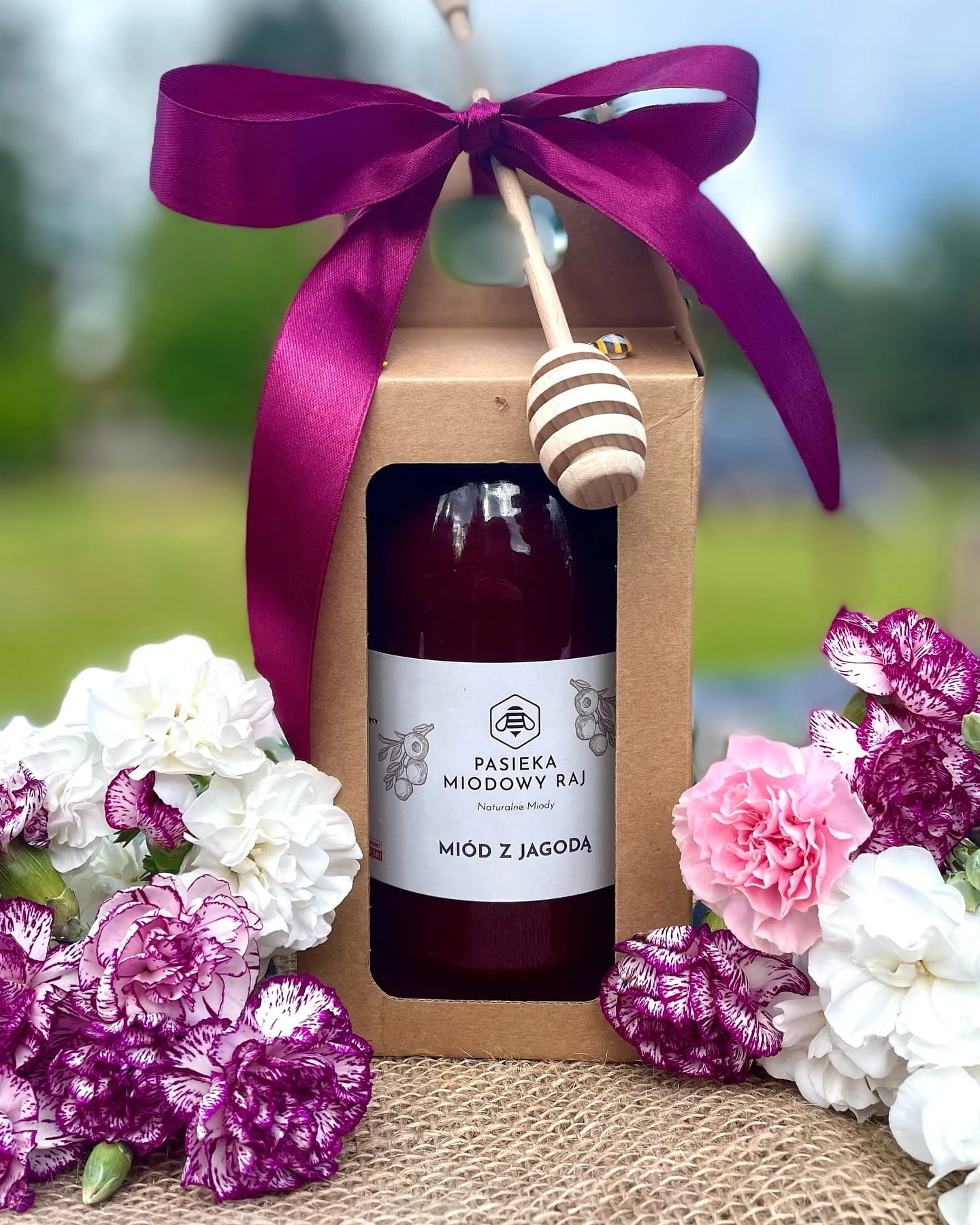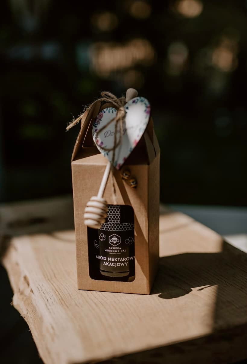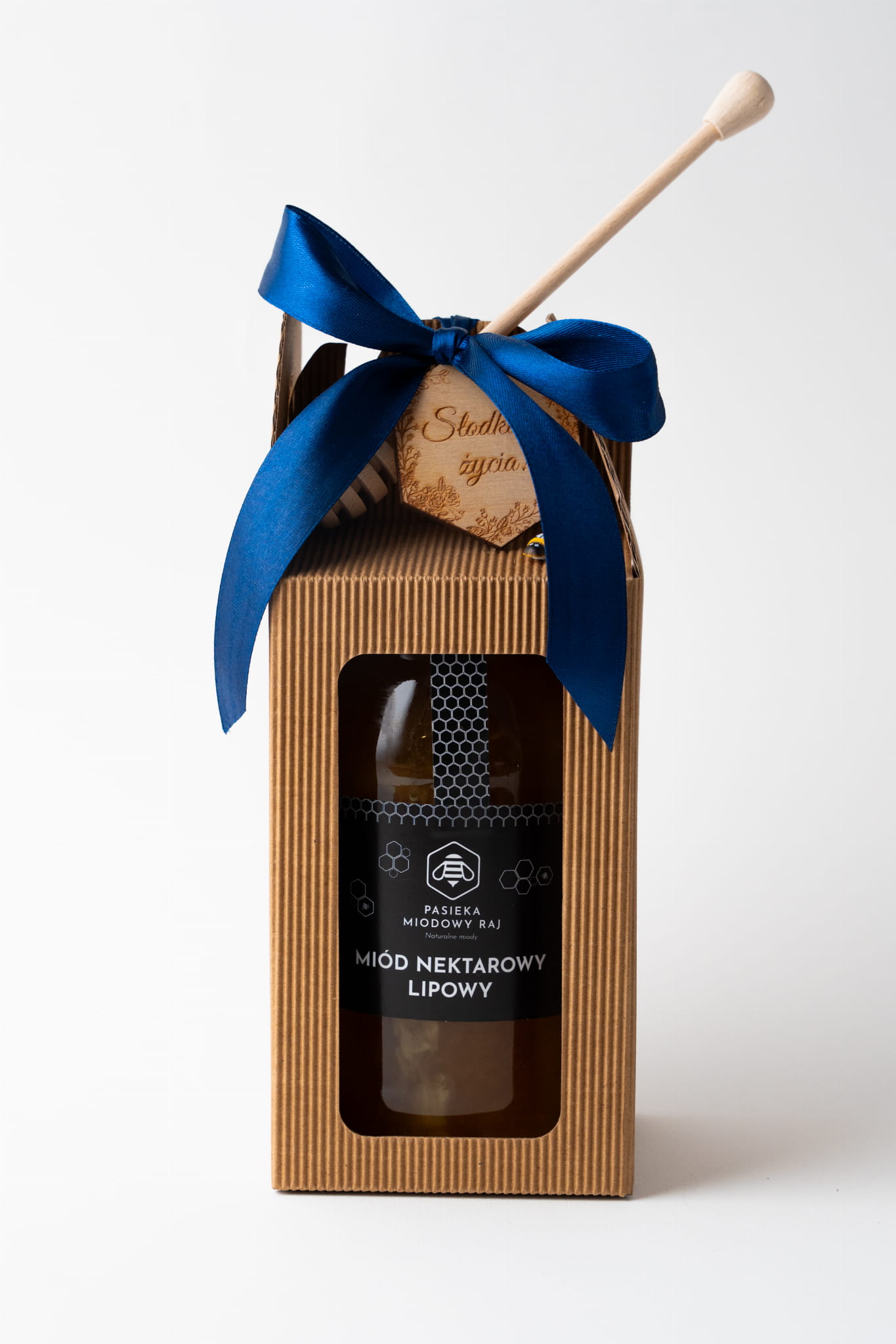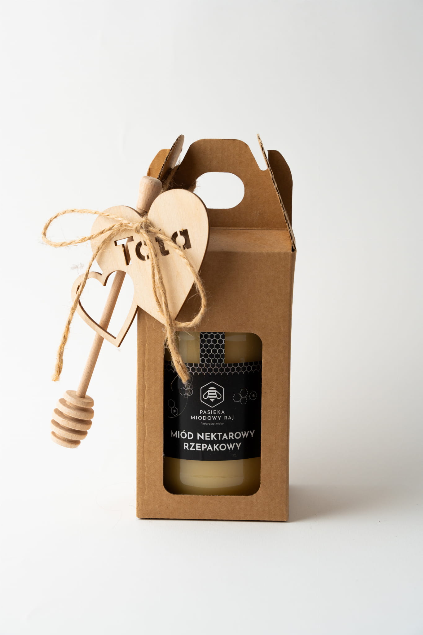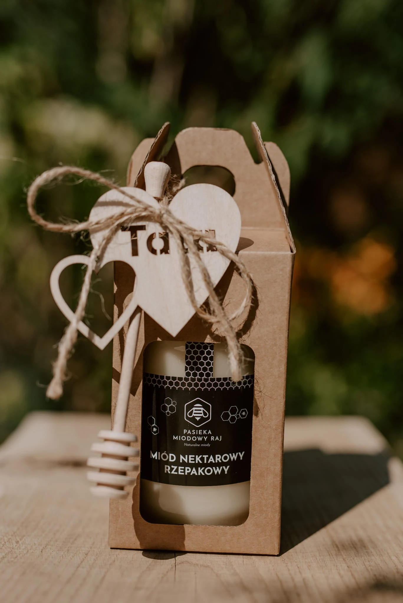 Zestaw z jednym miodem w eleganckim ekologicznym kartoniku z zawieszką i drewnianym nabierakiem. Pokaż swoim bliskim, że o nich pamiętasz!
