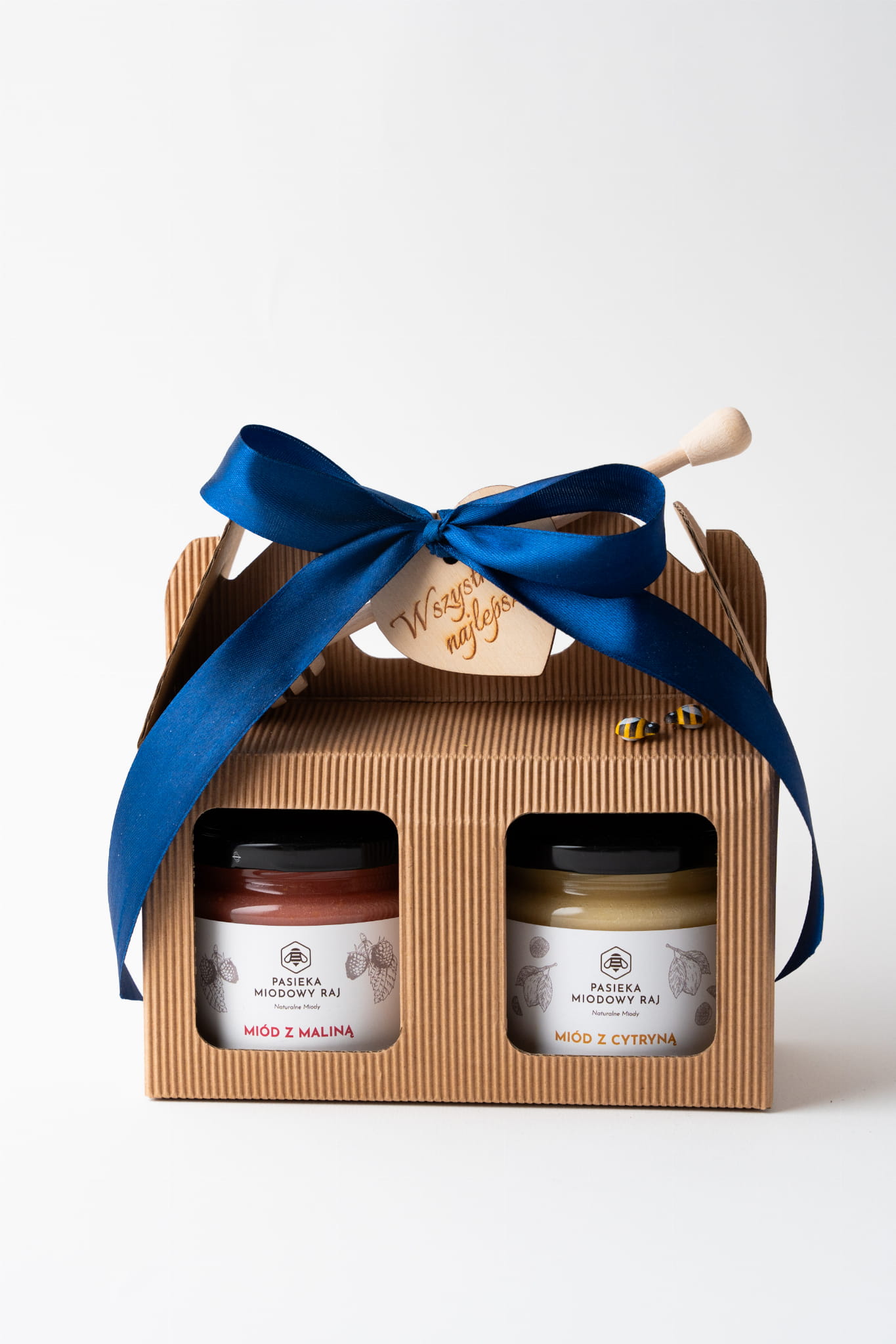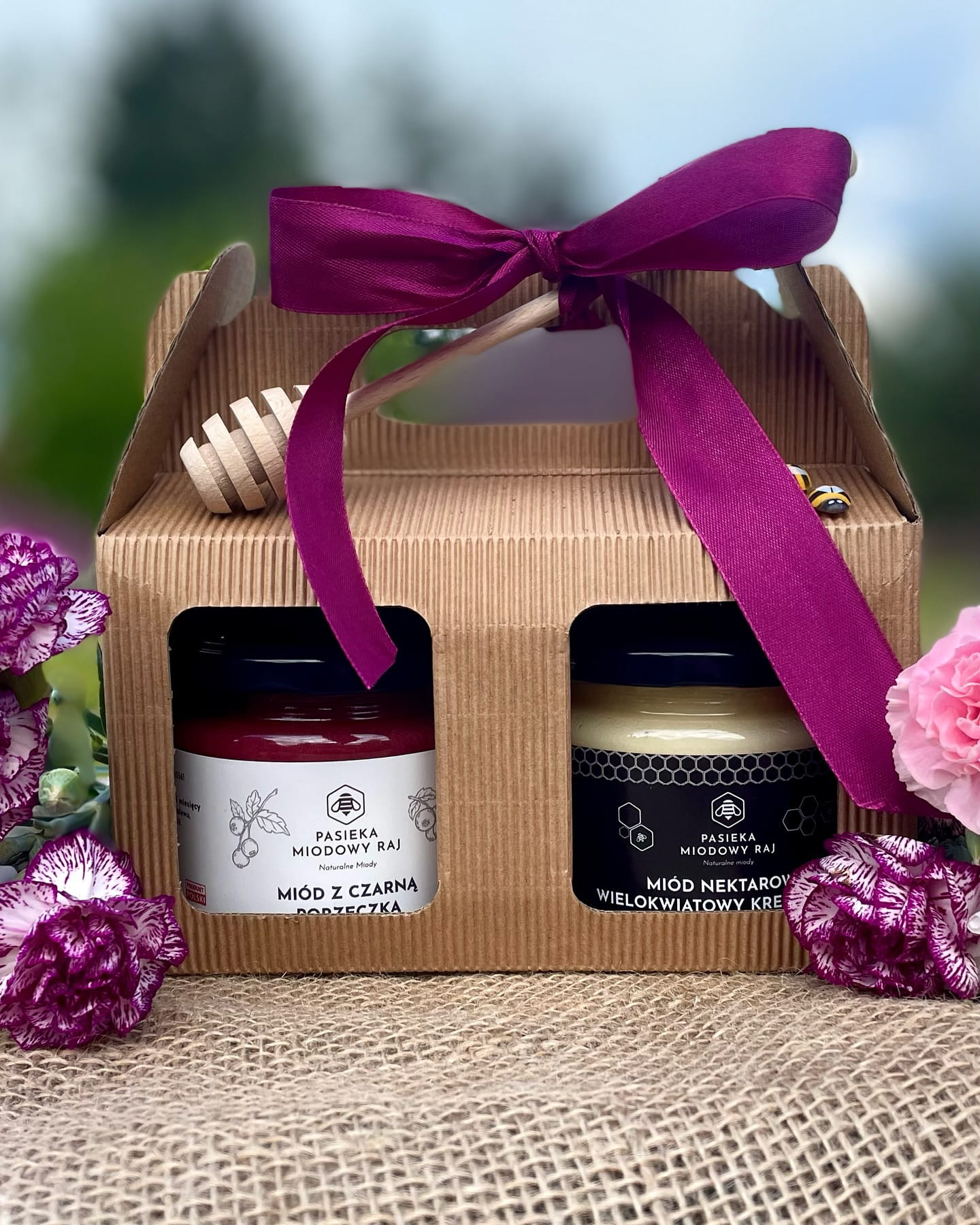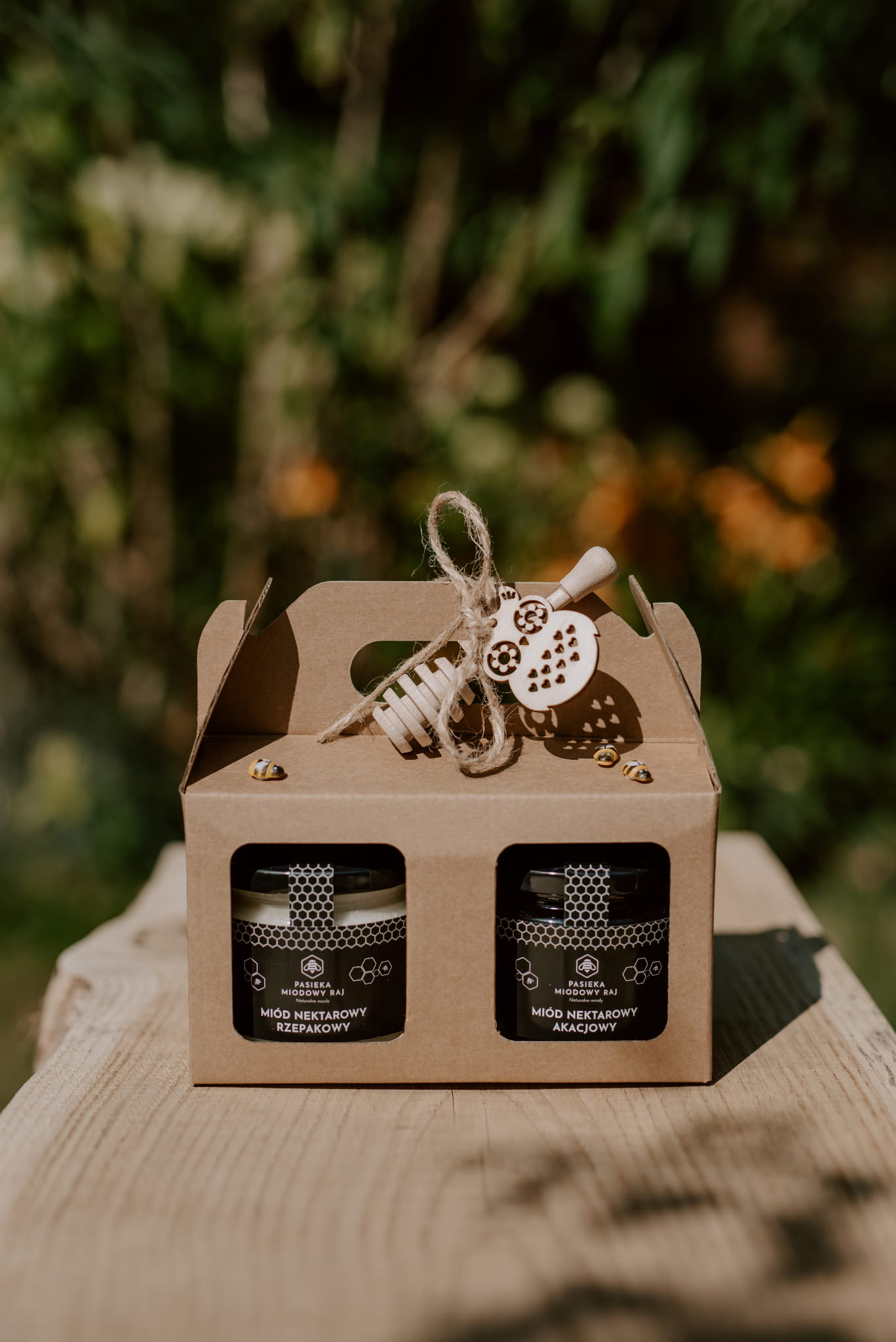 Zestaw z dwoma miodami w eleganckim ekologicznym kartoniku z zawieszką i drewnianym nabierakiem. Pokaż swoim bliskim, że o nich pamiętasz!