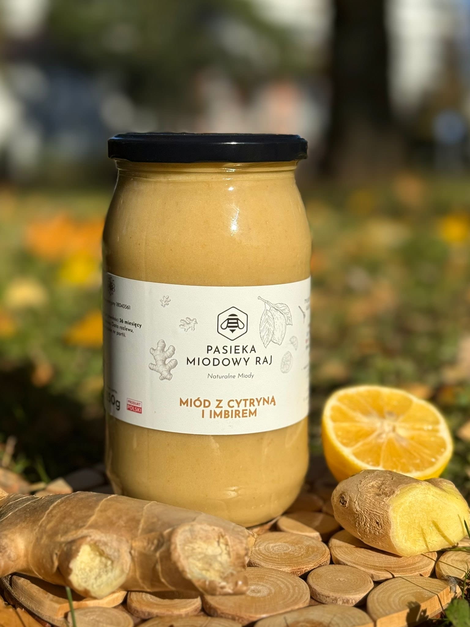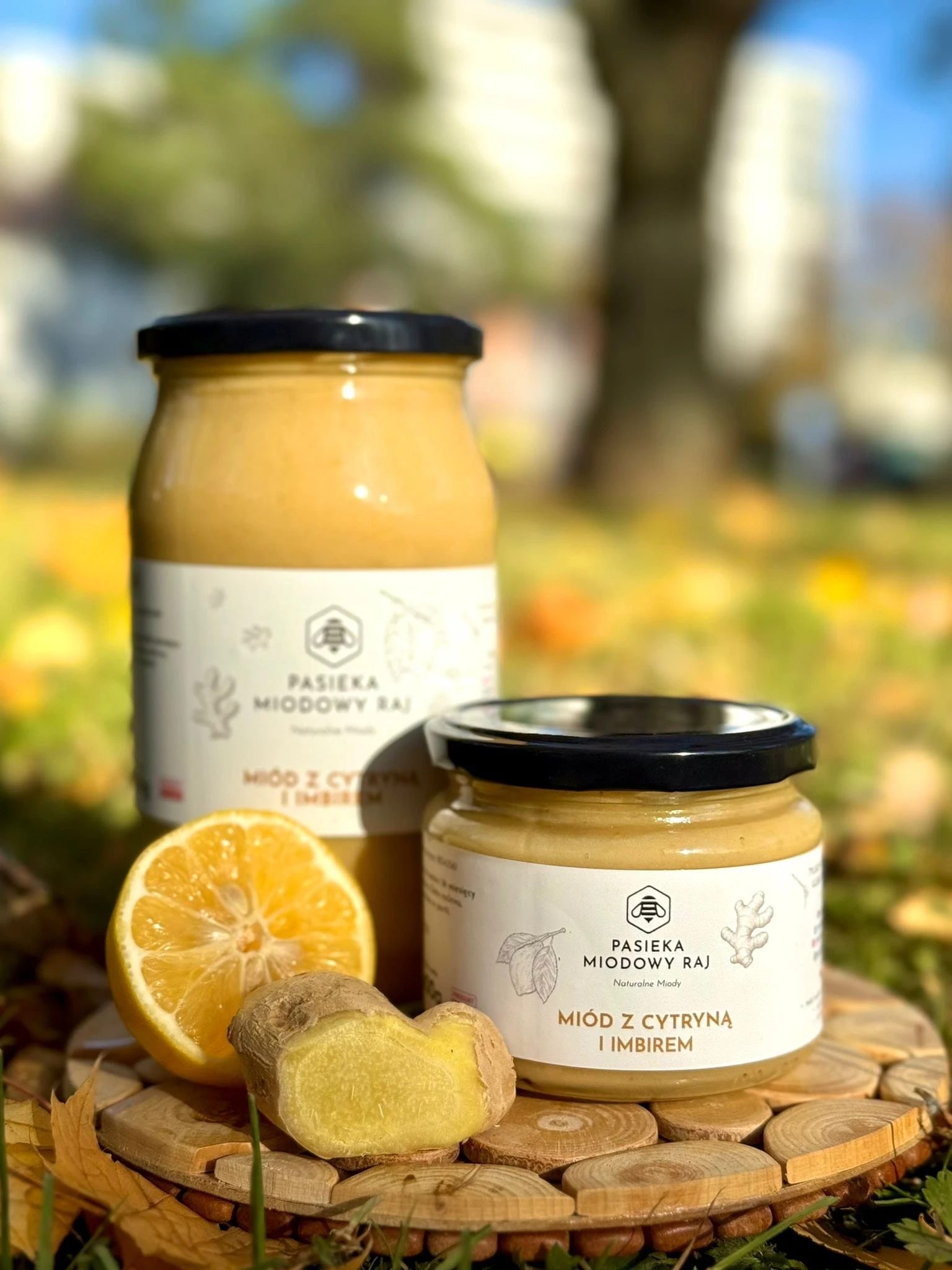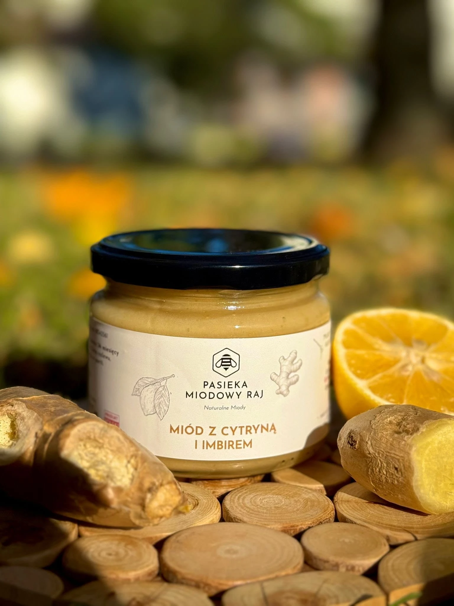 Kremowy, naturalny miód wielokwiatowy z orzeźwiającym owocem cytryny i rozgrzewającym lekko pikantnym imbirem! Dodatek tych składników z delikatną kwasowością, równoważy słodycz miodu, w połączeniu to prawdziwa bomba smakowa! Każdy słoik zawiera 95% prawdziwego miodu wielokwiatowego i 3% owoców liofilizowanej cytryny i 2% liofilizowanego imbiru i uwierzcie, nam na słowo połączenie tych trzech składników sprawia, że ten miód jest... po prostu fantastyczny!