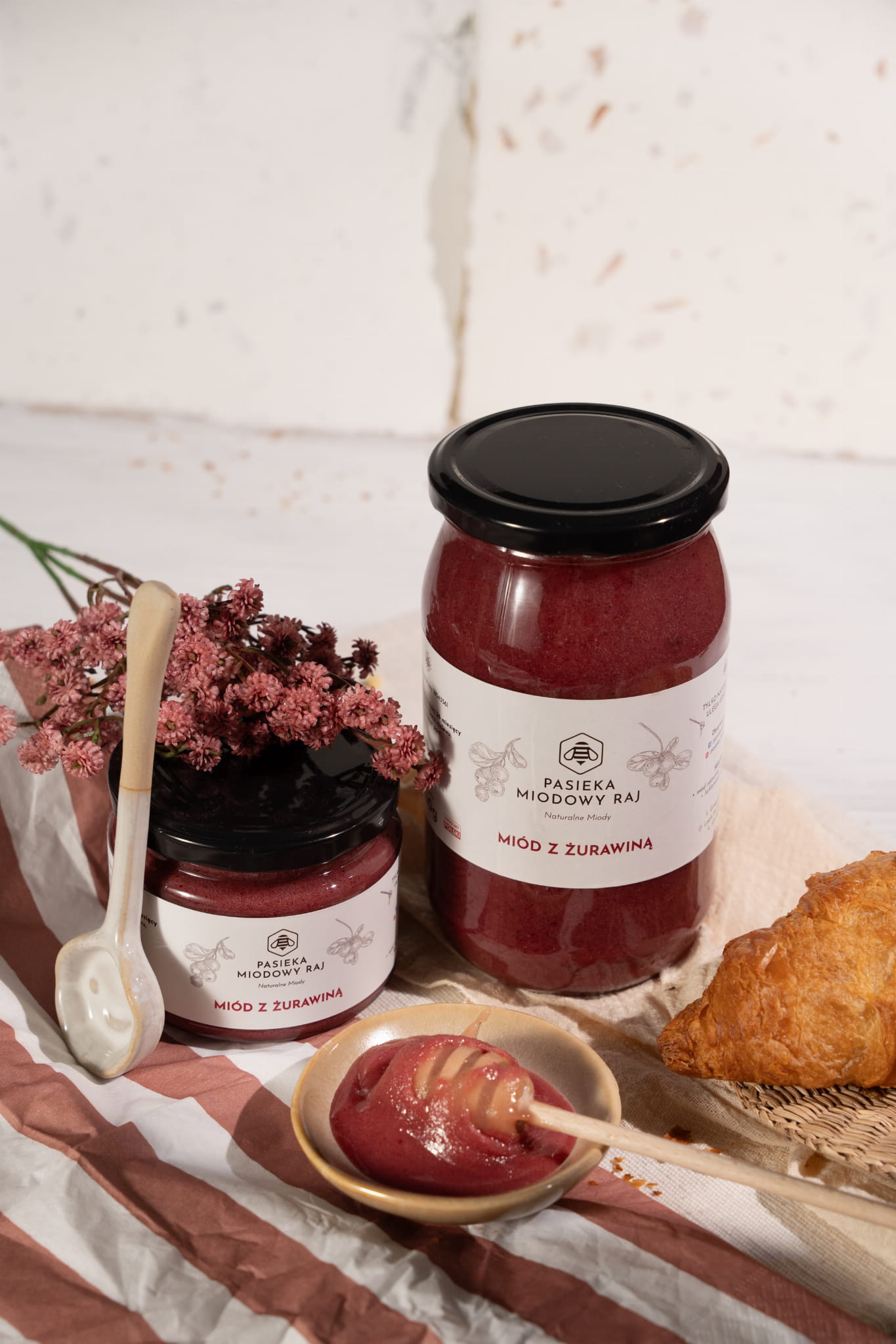 Połączenie klasycznego miodu wielokwiatowego z naszej pasieki, z owocem liofilizowanej żurawiny. Jeden z owoców o mocno terapeutycznym działaniu. A ten kolor, sami spójrzcie!