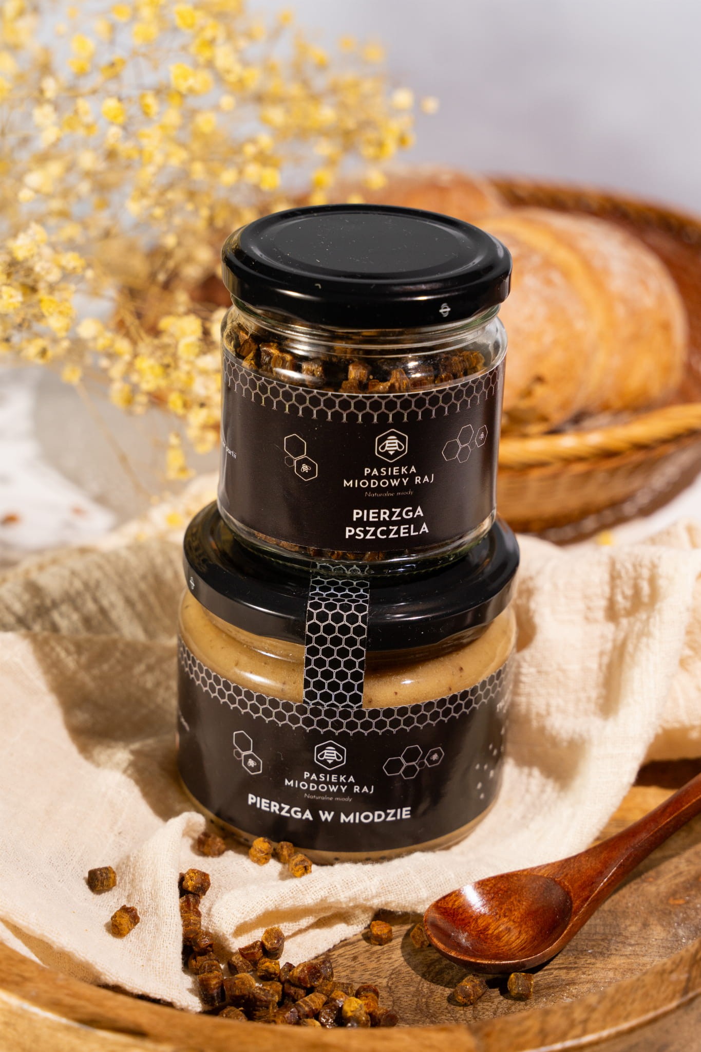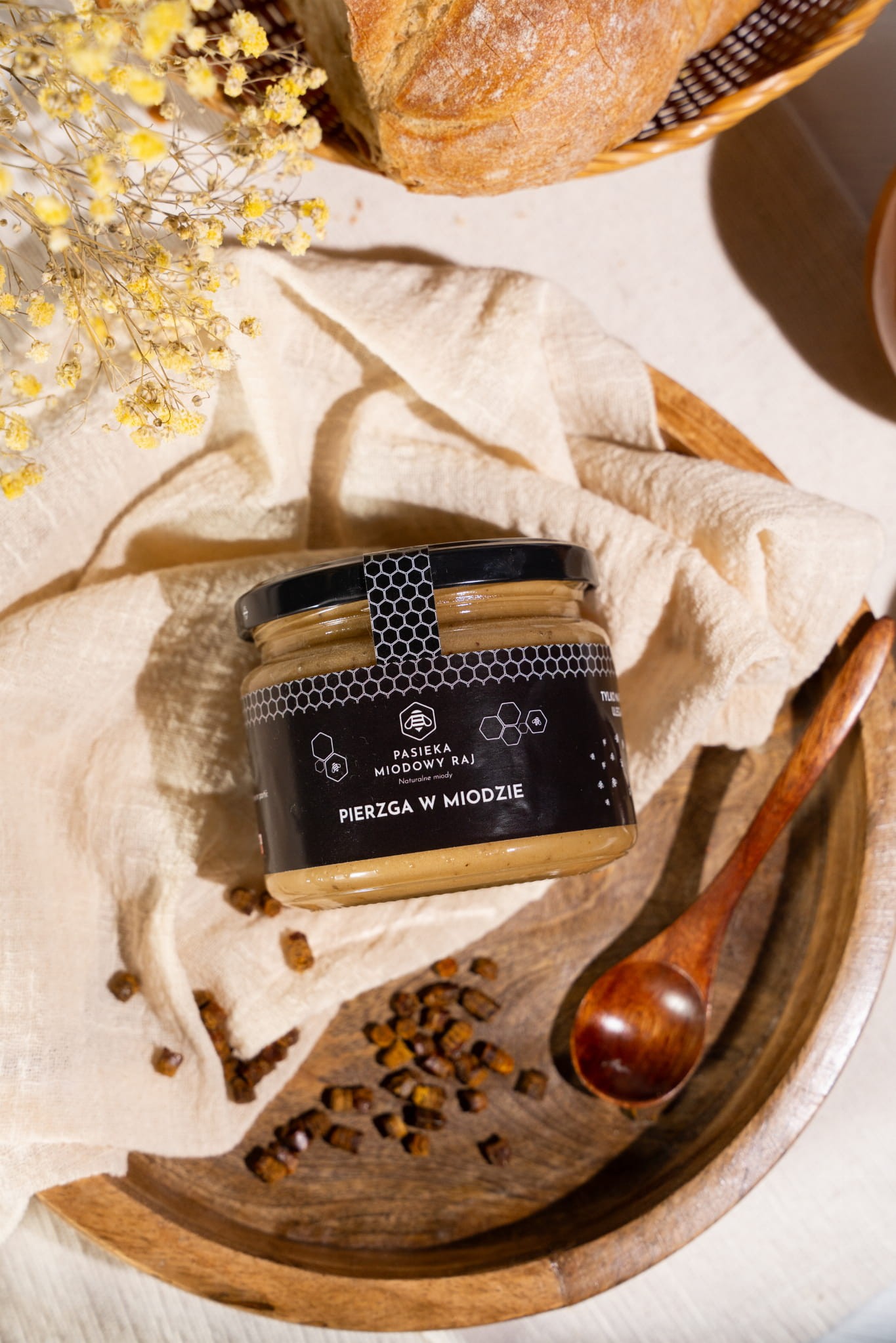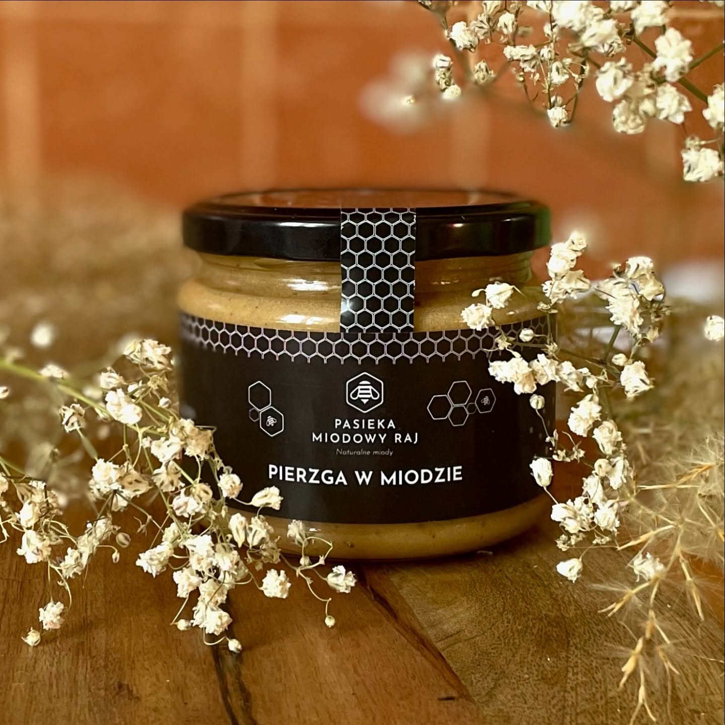 Pierzga w miodzie – jest połączeniem miodu wielokwiatowego (90%) i pierzgi pszczelej (10%). Połączenie tych dwóch produktów wspomaga układ odpornościowy i pokarmowy. Pierzga w połączeniu z miodem jest wygodna w użyciu, ponieważ możemy ją spożywać bez rozpuszczania w wodzie. Codzienna łyżeczka miodu z pierzgą dostarczy naszemu organizmowi cennych witamin takich jak – (C, B1, B2, B3, B6, B12, A, PP, K, E, H, D), a także mikro- i makroelementów, takich jak magnez, żelazo, miedź, cynk, potas, fosfor, czy sód. Pierzga pszczela jest to produkt bogaty w składniki odżywcze wykazujące liczne właściwości prozdrowotne. Przede wszystkim ułatwia proces trawienia, ma pozytywny wpływ na pracę wątroby, żołądka oraz jelit. Składa się z pyłku kwiatowego, mleczka pszczelego, miodu oraz cennych enzymów pszczelich.